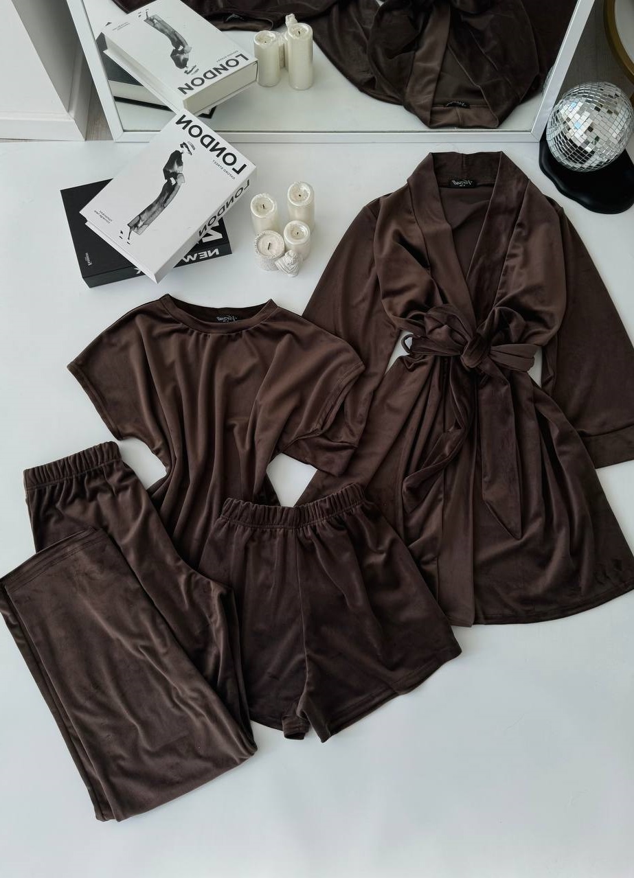 Женский комплект четвёрка из плюша (халат+шорты+футболка+брюки) коричневый