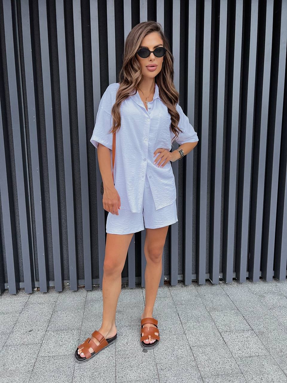 Женский костюм из жатки: рубашка на пуговицах с коротким рукавом и шорты белый