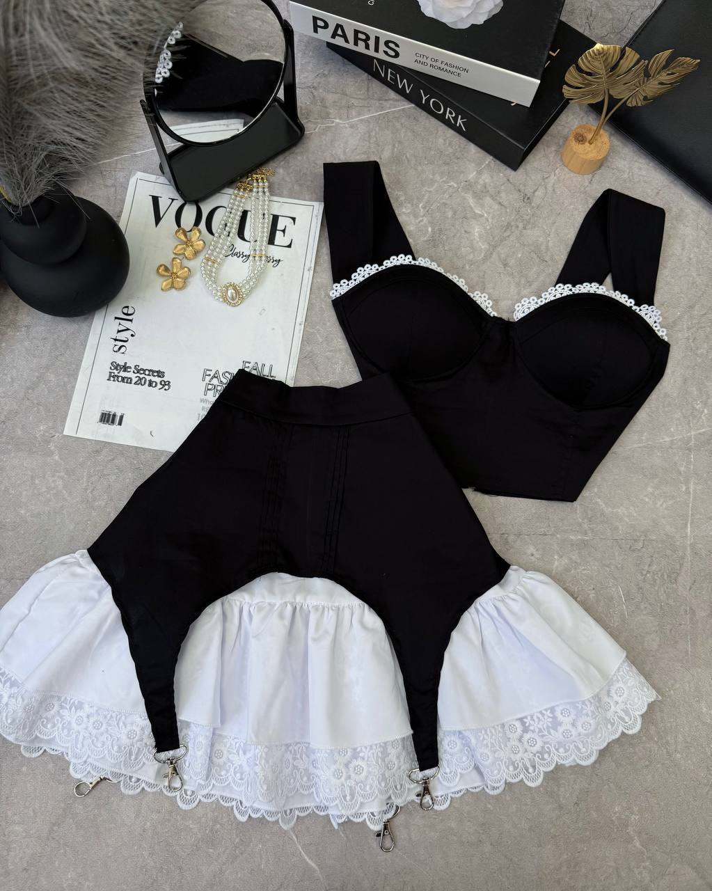 Изысканный костюм из топа и юбки, для любых событий или прогулок. Топ на лямках, идет с чашками, спинка на змейке. Юбка двойная, сзади идет на змейке тоже. Фурнитура на серебряном костюме.