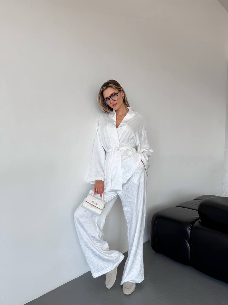Женский шелковый костюм: рубашка-кимоно с поясом+брюки молочный