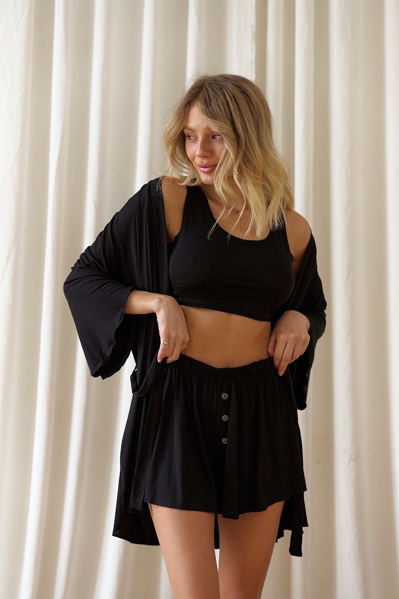 Женский трикотажный комплект топ, шорты и халат для дома и сна. Ткань эластичная и приятная для тела. Халат на запах, рукава три четверти.