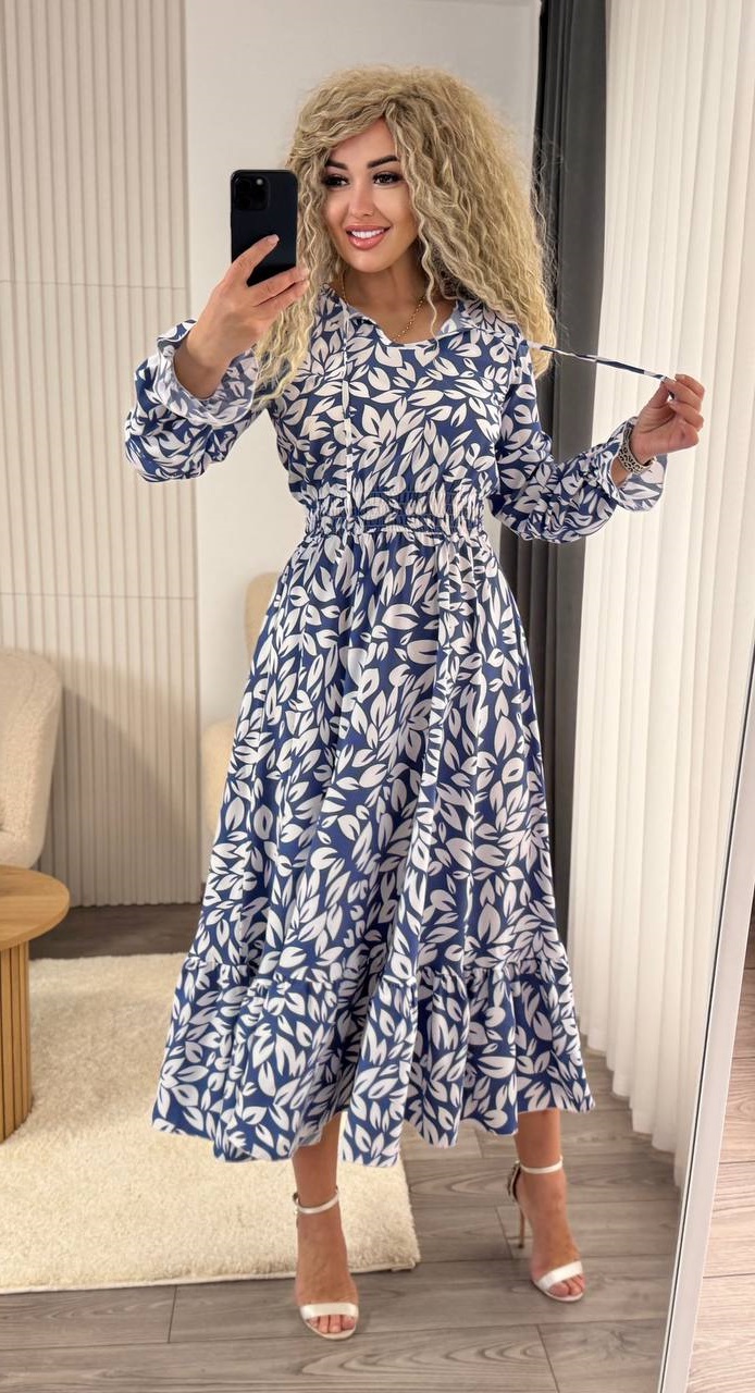 Женственная Платье с расклешенной юбкой и воланом+талия на резинке принт листья синий