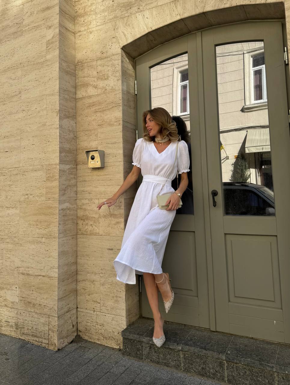 Женственное легкое платье из муслина с рукавом фонарик длиной миди белый