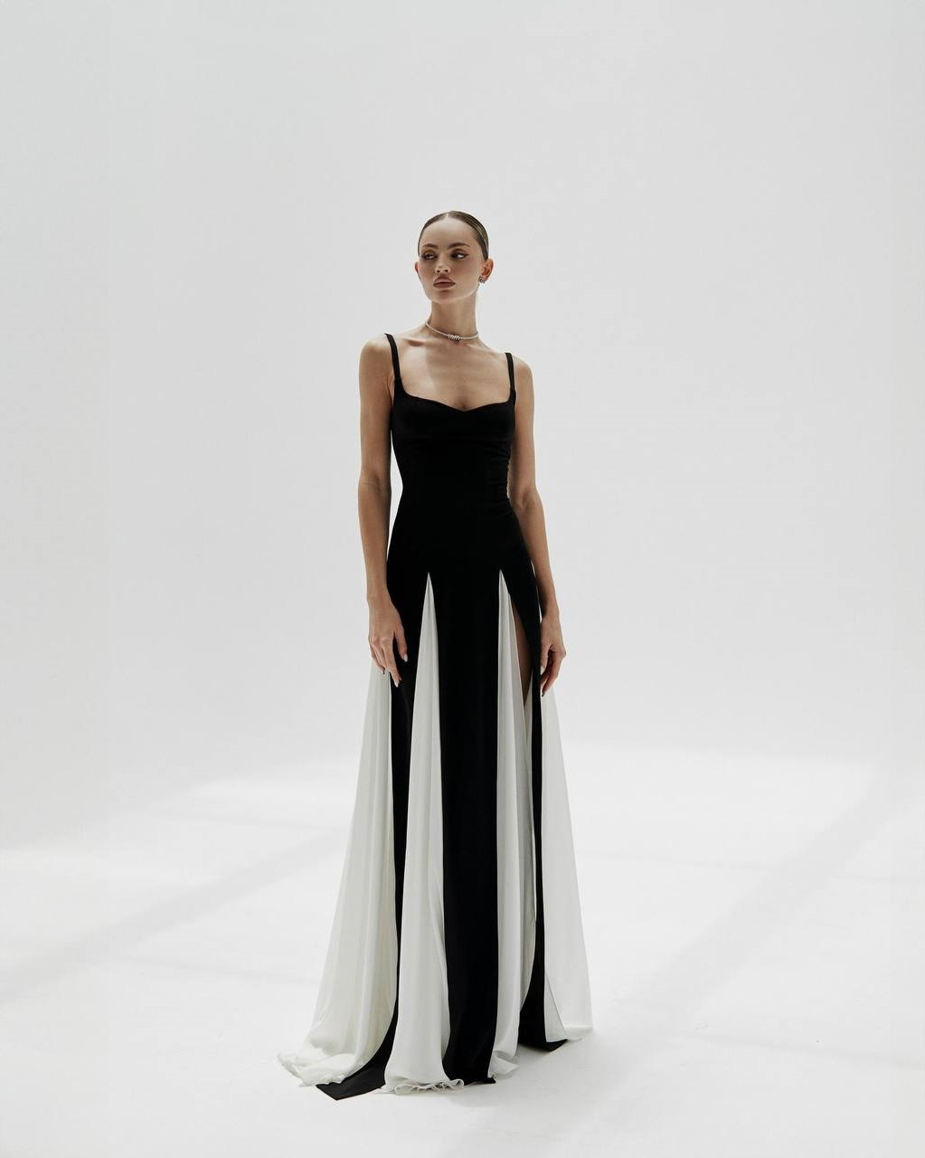 Головна » Магазин » ОДЕЖДА » ПЛАТЬЯ ТУНИКИ САРАФАНЫ » Женственное платье с расклешенной юбкой+акцентными вставками по юбке на бретелях черно-белый