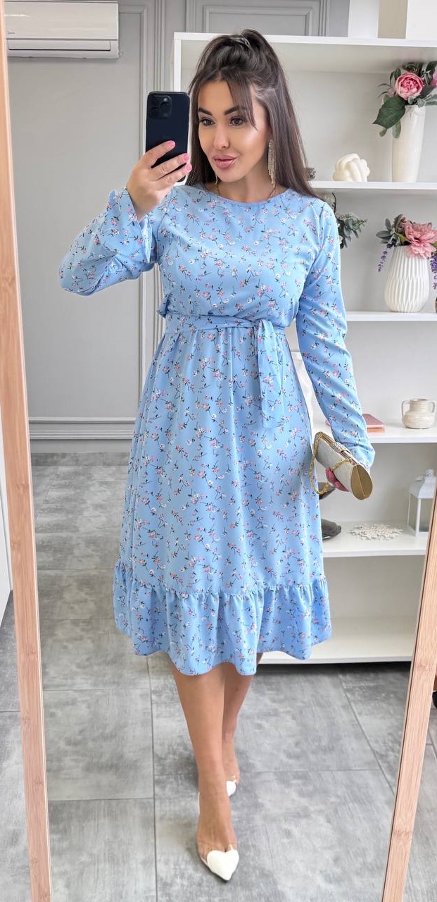 Женственное платье с воланом по низу+по талии резинка длина миди голубой