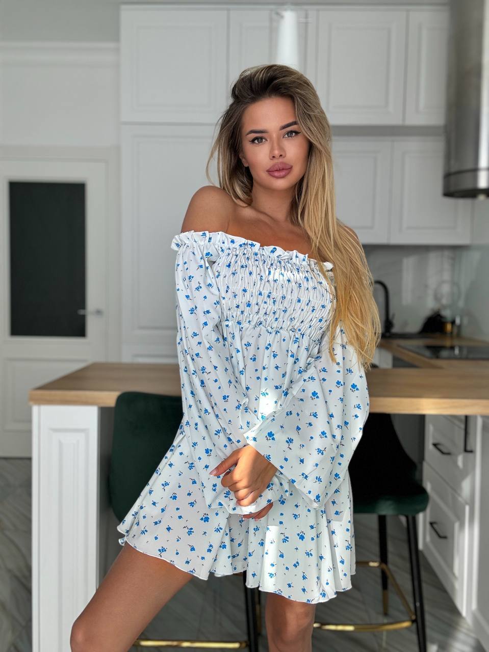 Женственное платье (Верх платья идет на резиночках) белый с голубым цветком