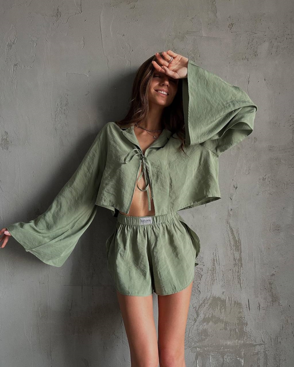 Женственный комплект для отдыха (рубашка на завязках+ свободные шорты) оливка
