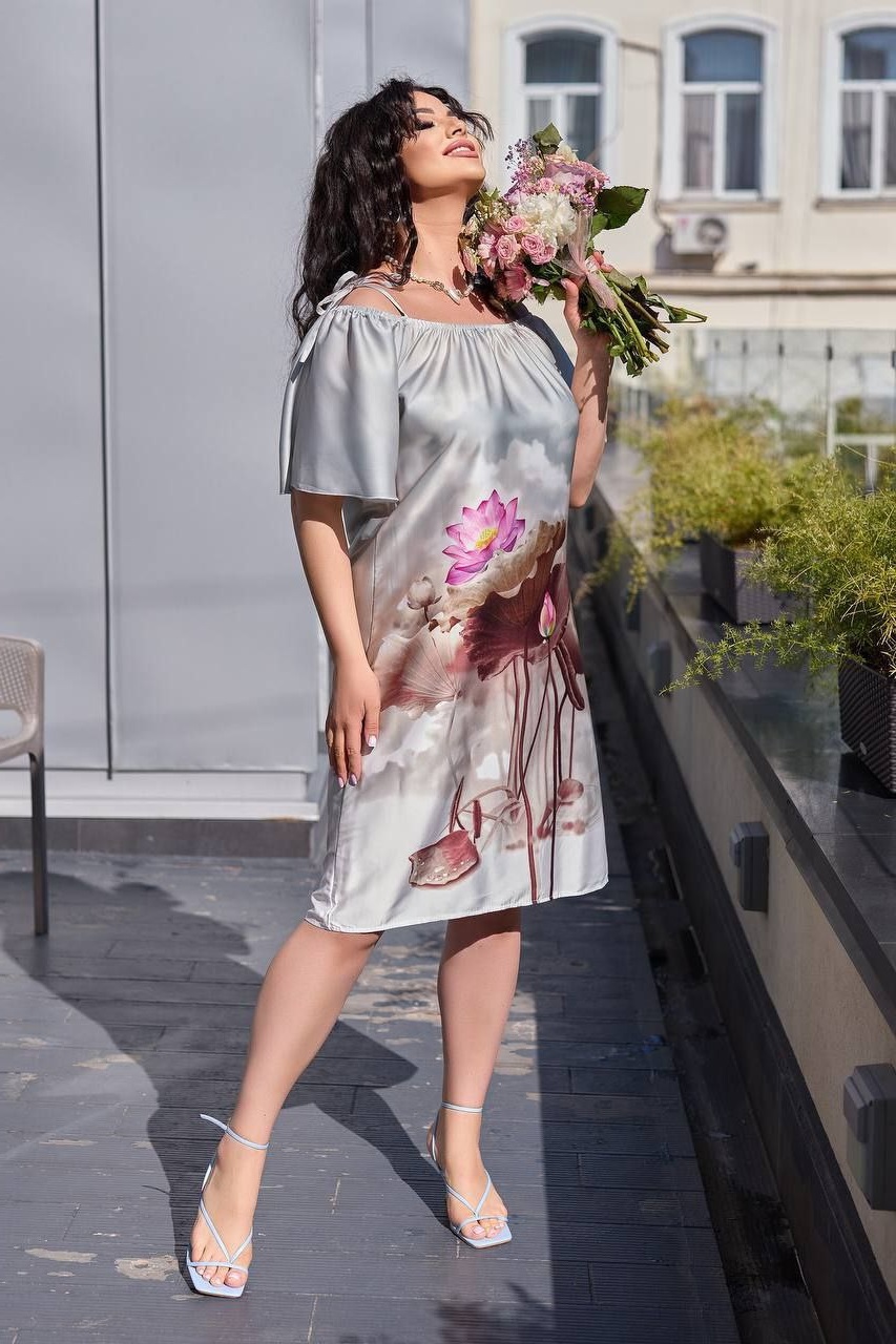 Головна » Магазин » Одяг » Сукня туніка сарафані » Атласное шелковое летнее платье с цветами серый
