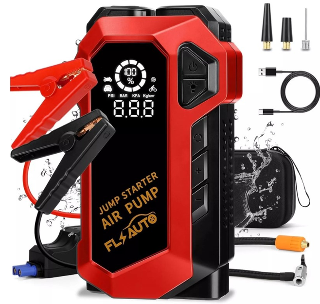 Оно сочетает функции мощного пускового устройства автомобильного аккумулятора и встроенного компрессора для закачки шин.