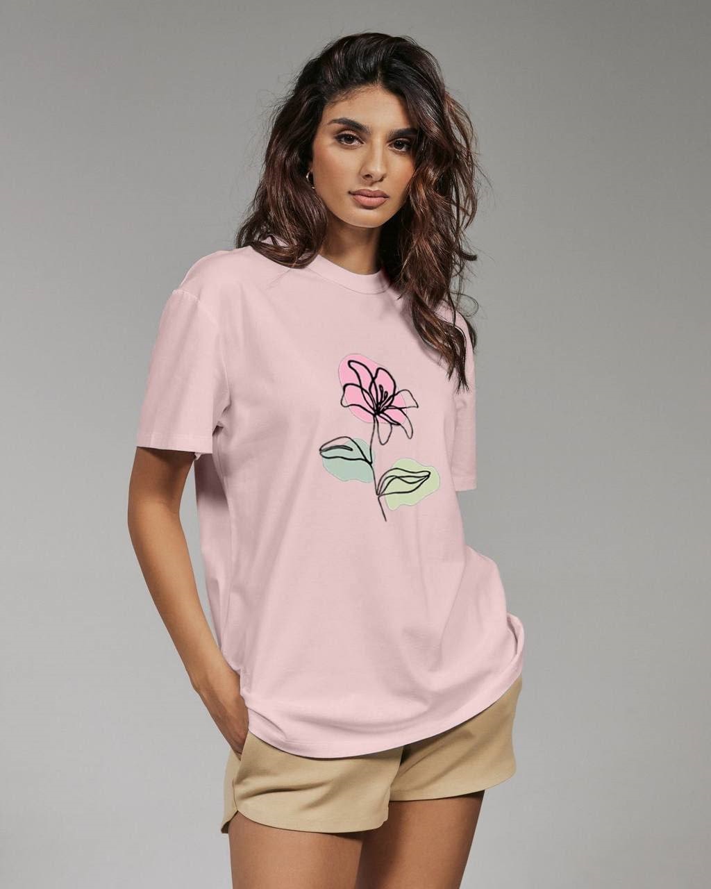 Базовая футболка с коротким рукавом+накатом цветочек хлопок пудра