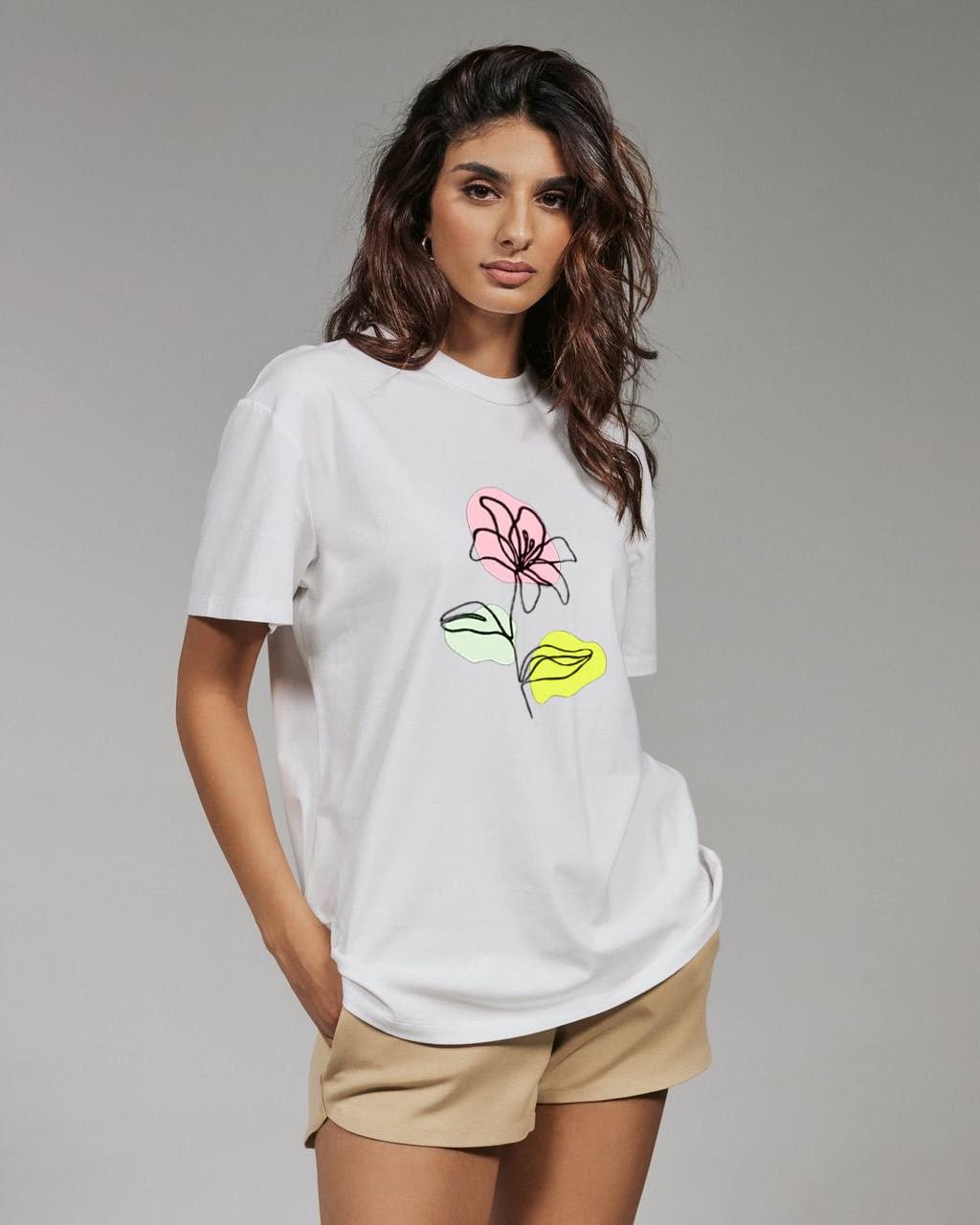 Базовая футболка с коротким рукавом+накатом цветочек хлопок белый