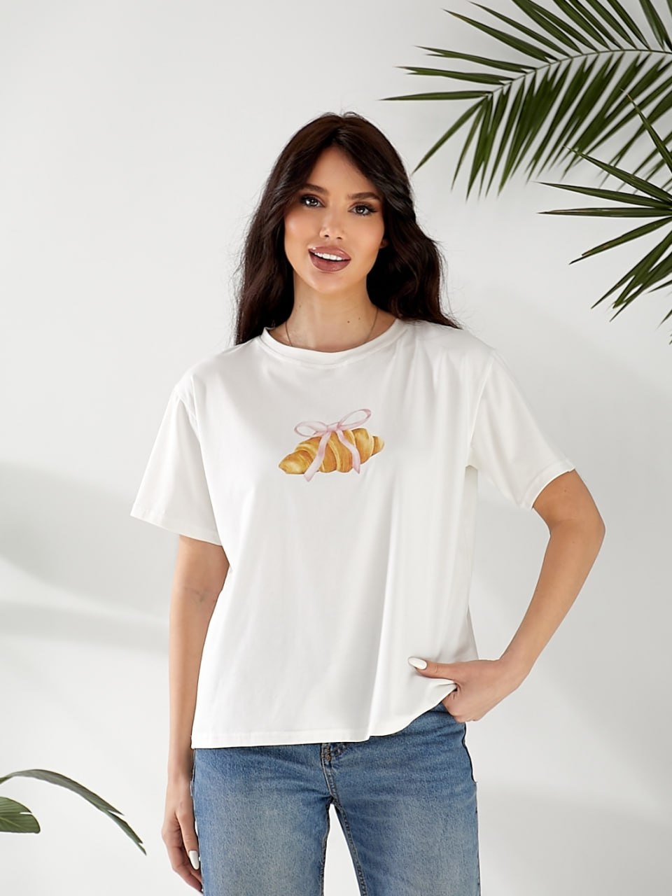 Базовая футболка с нежным круассановым принтом. Свободный крой, приятная на ощупь ткань, идеальная для повседневного образа.