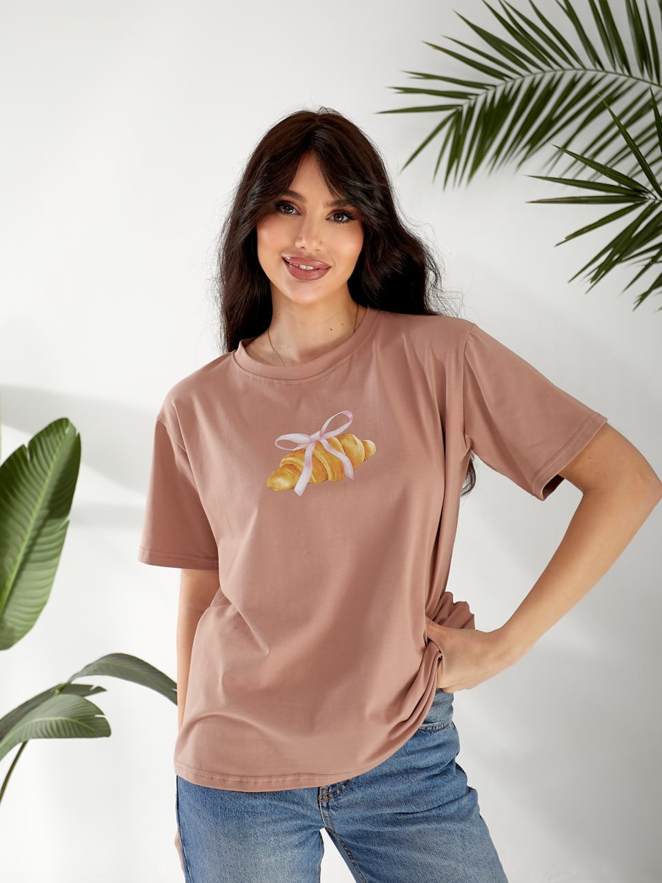 Базовая футболка с нежным круассановым принтом. Свободный крой, приятная на ощупь ткань, идеальная для повседневного образа.