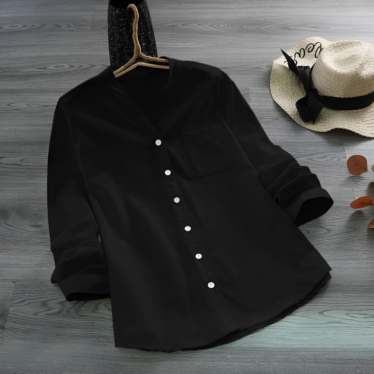 Девочки, вы только посмотрите на эту рубашку! Модель с длинным рукавом, лаконичным воротником-стойким и аккуратным карманом на груди.