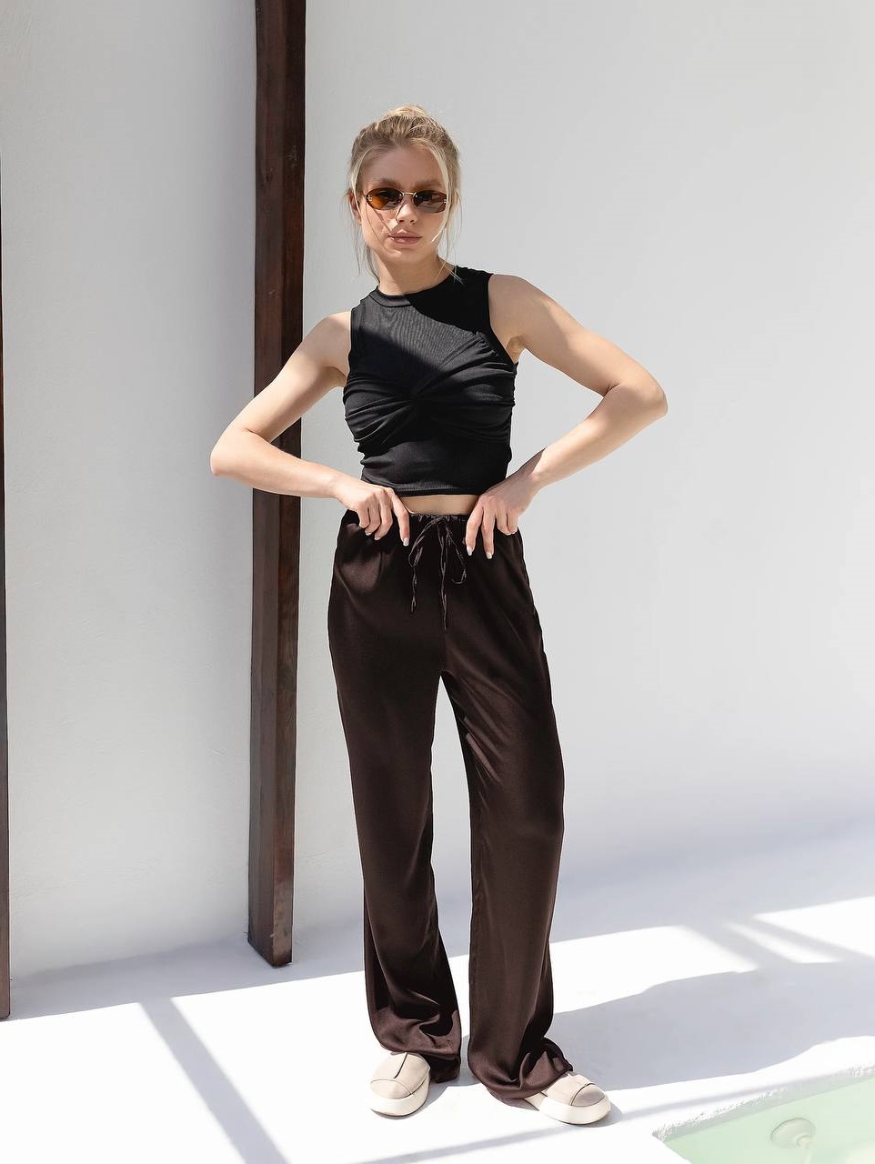 Головна » Магазин » Одяг » Жіночі штани джинси штани гетри » Базовые шелковые брюки прямого кроя талия на резинке шоколад