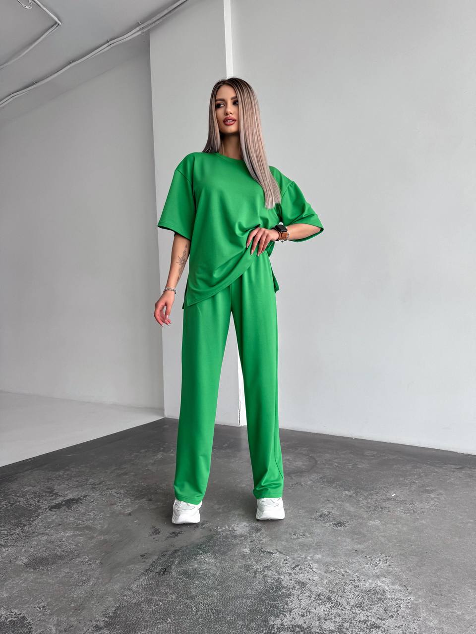Базовый костюм двойка: футболка со спущенным рукавом+штаны расширенные зеленый