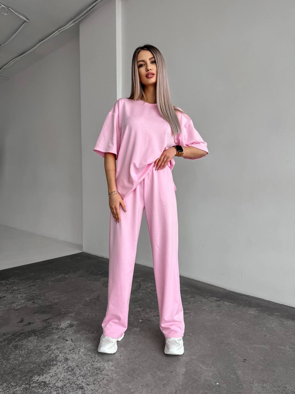 Базовый костюм двойка: футболка со спущенным рукавом+штаны расширенные розовый