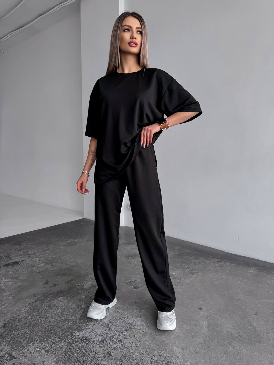 Базовый костюм двойка: футболка со спущенным рукавом+штаны расширенные черный
