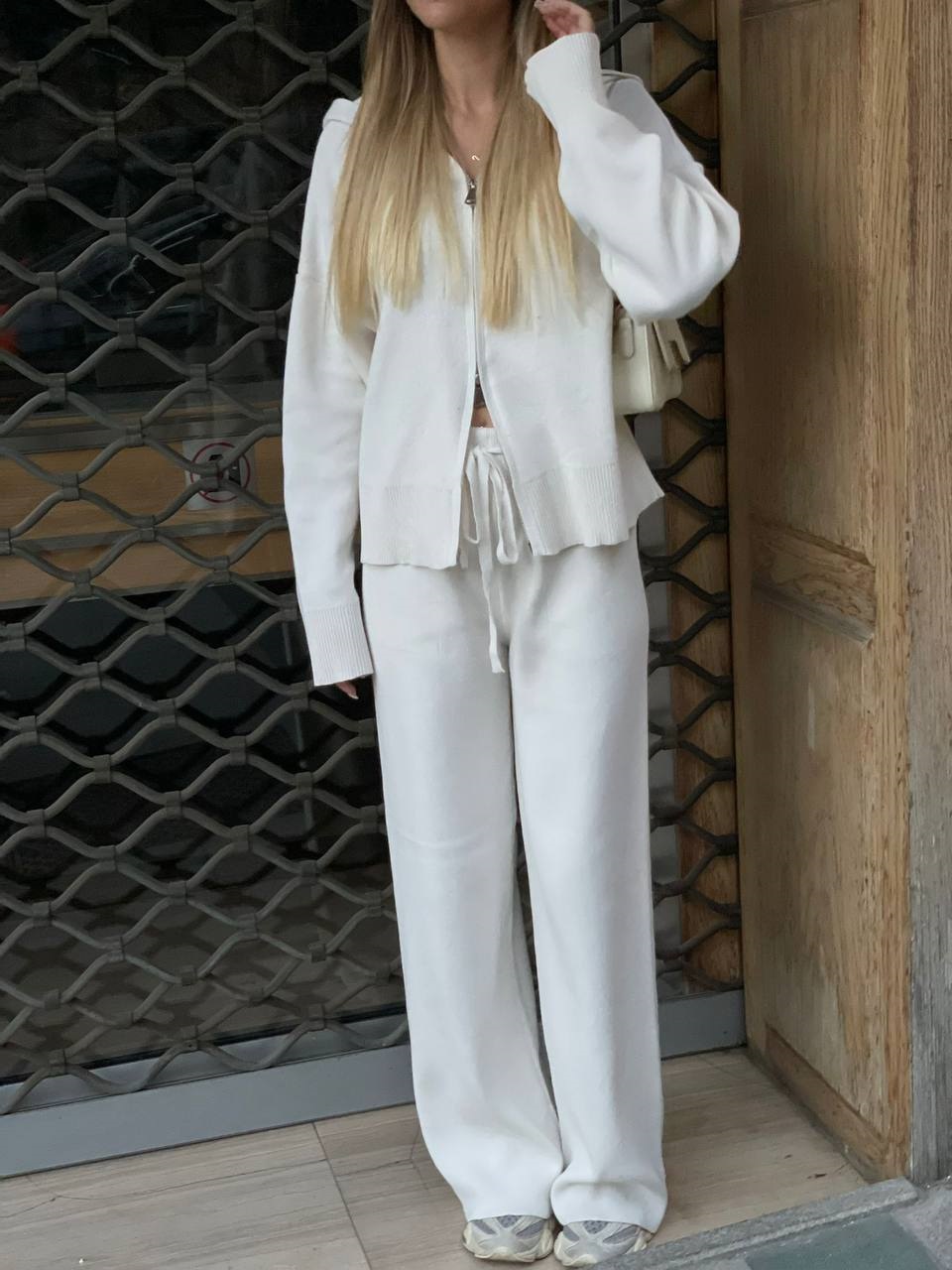 Трикотажный костюм-двойка, состоящий из джемпера свободного кроя и трендовых палаццо.