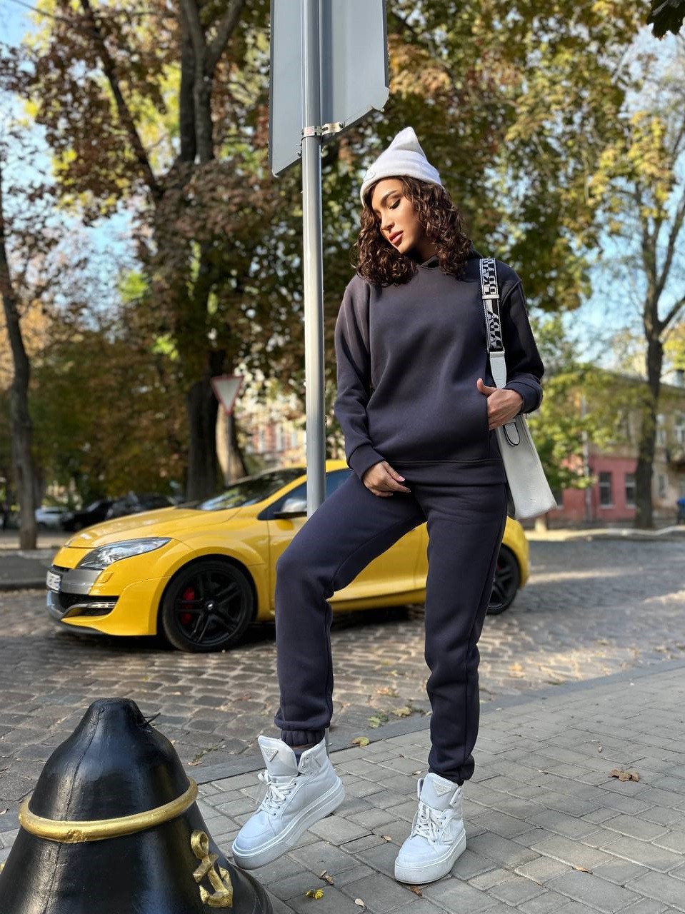 Базовый теплый костюм, брюки с высокой посадкой, свободная удлиненная кофточка с карманами.