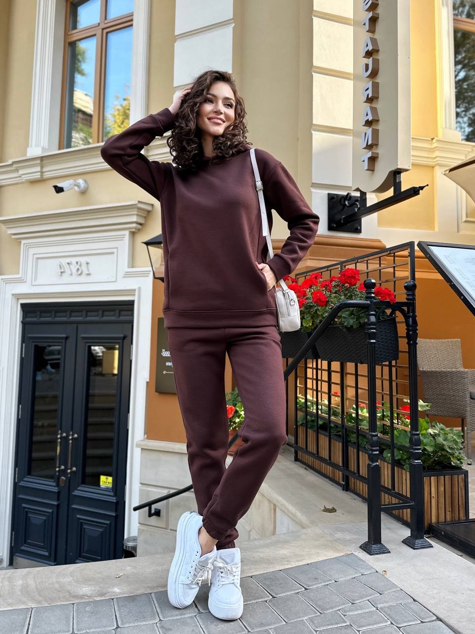 Базовый теплый костюм, брюки с высокой посадкой, свободная удлиненная кофточка с карманами.