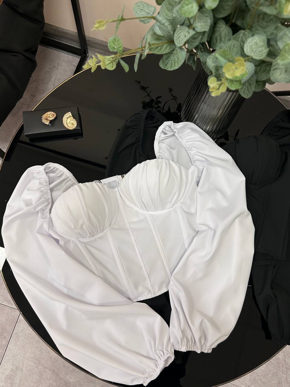 Базовый топ с имитацией корсета (вшитые косточки), подойдет к любому твоему образу. Идет с чашками, хорошо подчеркивает грудь. Рукава одеваются на плечи или можно спускать, как удобнее, на резиночке. Ткань тянется, не светится и приятна к телу. На спинке есть змейка.