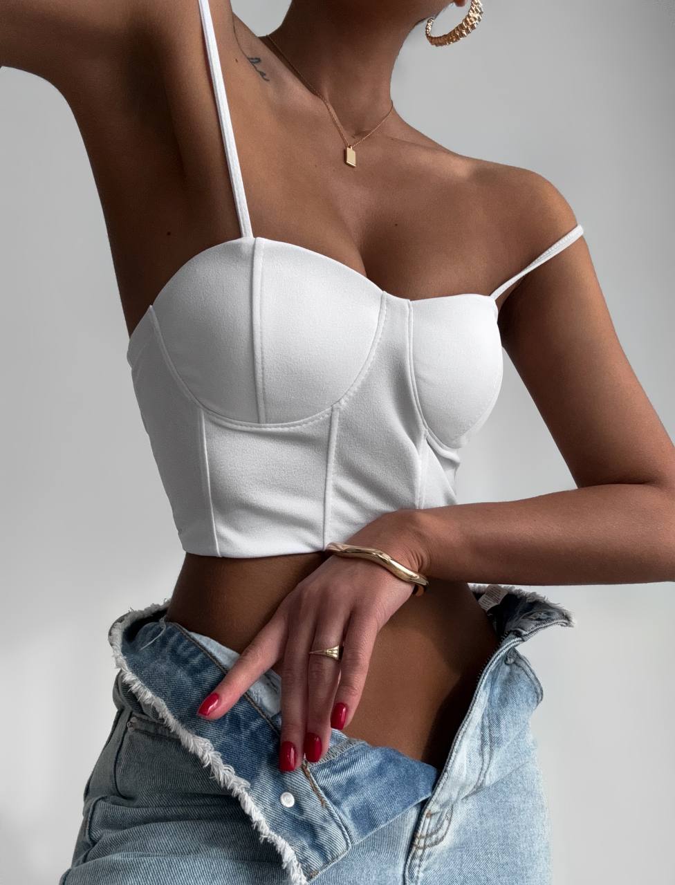 Базовый топ с чашками, хорошо подчеркивающий грудь. К любому вашему образу. Ткань немного тянется, лямки регулируются. На спинке змейка.