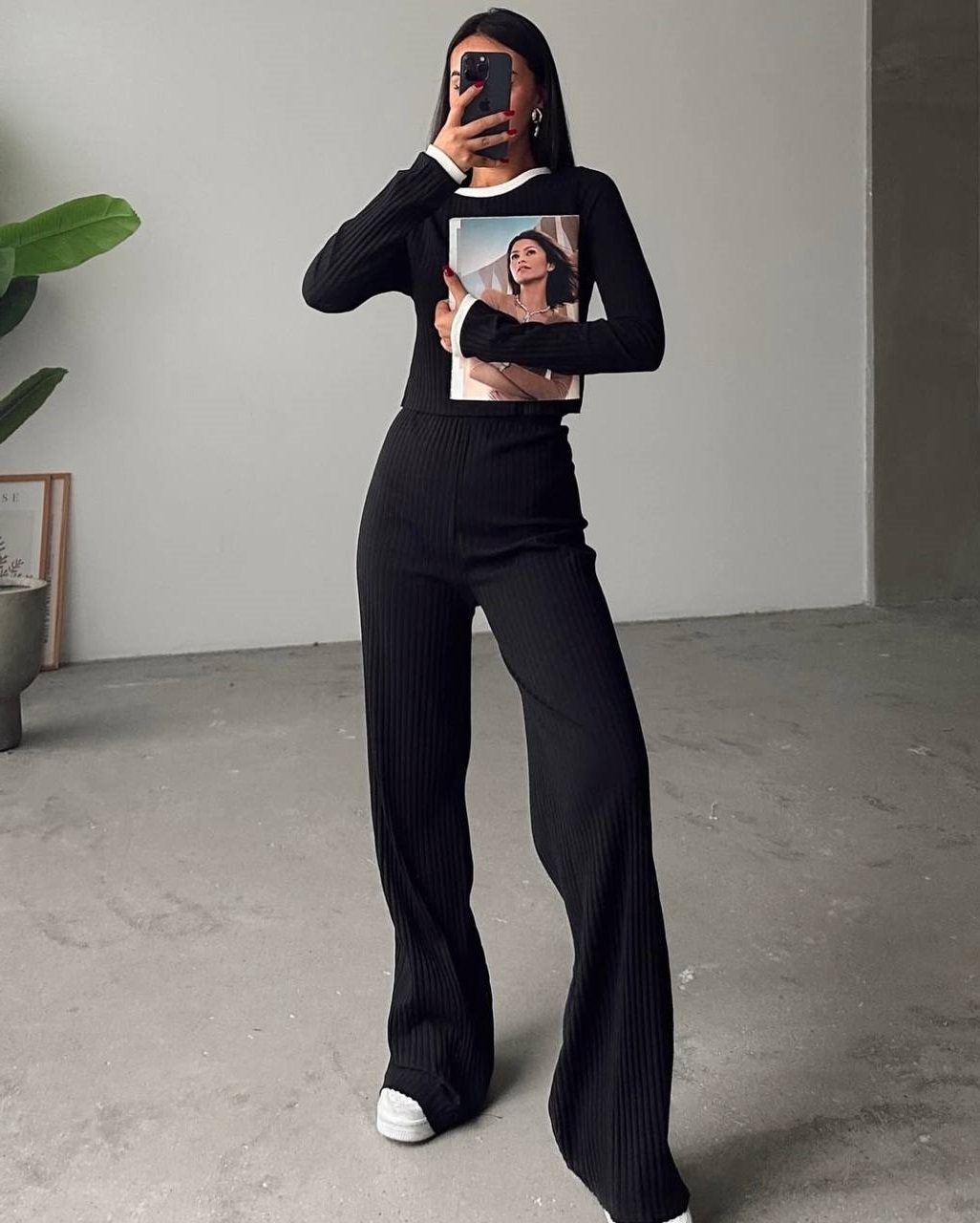 Базовые брюки и кофточка в популярных цветах.