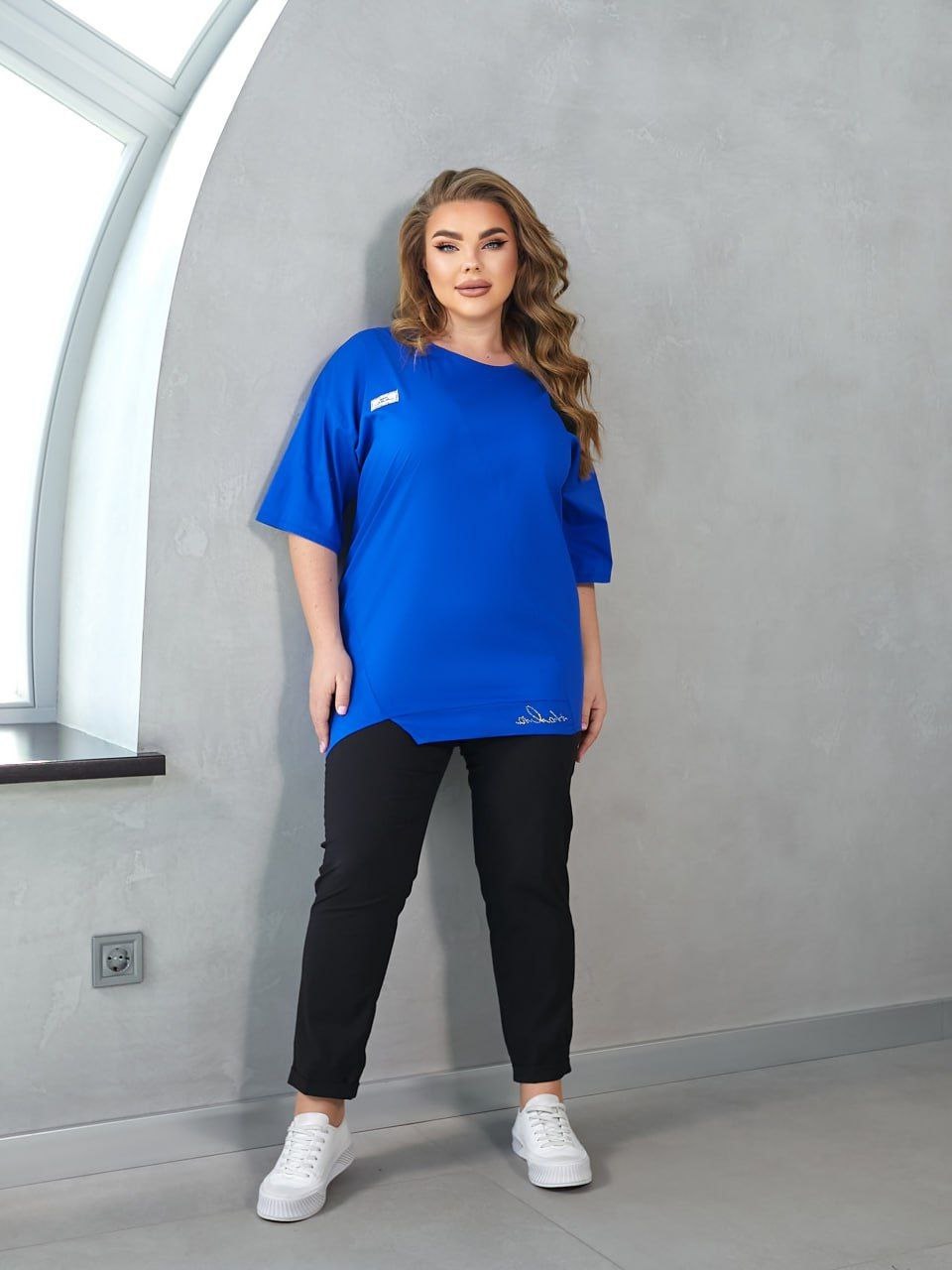 Блуза удлиненная со стразами стрейч коттон электрик