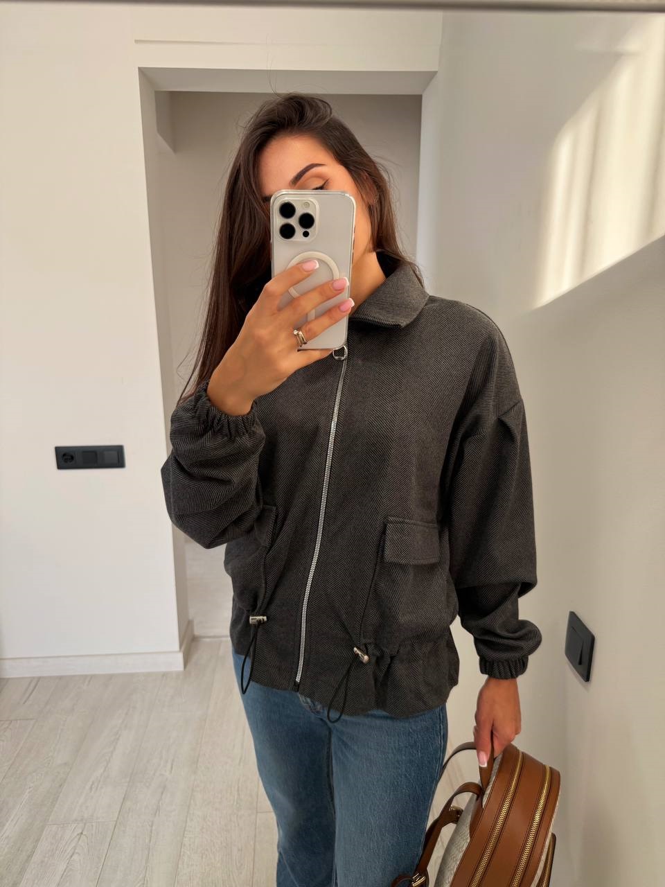 Бомбер на молнии с карманами+кулиской по низу кашемир принт елочка темный серый