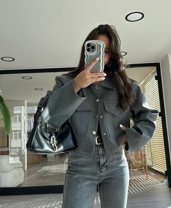 Головна » Магазин » Одяг » Жіночий верхній одяг » Бомбер на пуговицах с карманами из кашемира на подкладке серый