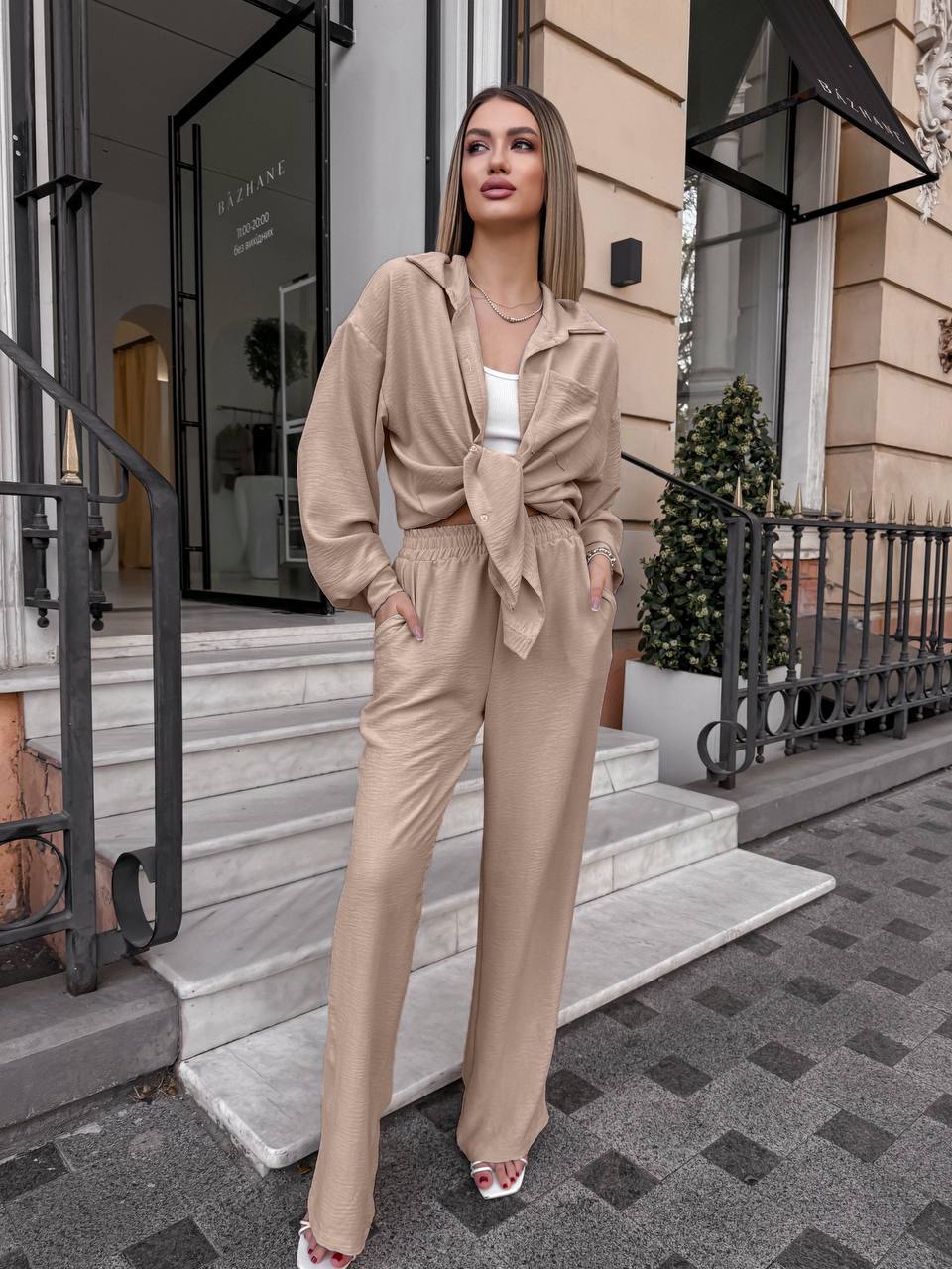 Брючный костюм из креп жатки: рубашка свободная с карманом+брюки темно-бежевый