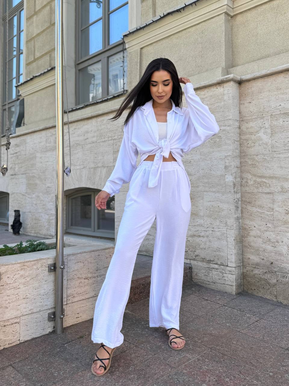 Брючный костюм из креп жатки: рубашка свободная+брюки палаццо с карманами белый