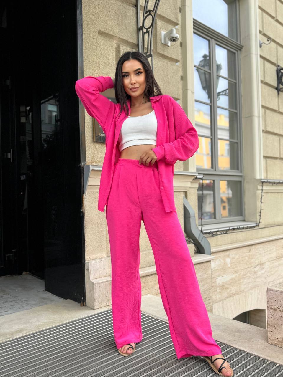 Брючный костюм из креп жатки: рубашка свободная+брюки палаццо с карманами малина