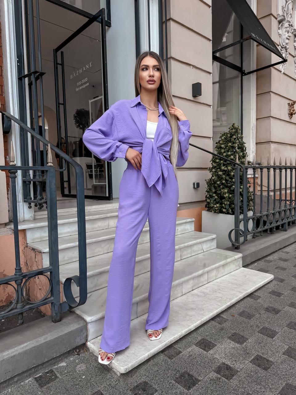 Брючный костюм из креп жатки: рубашка свободная с карманом+брюки лаванда