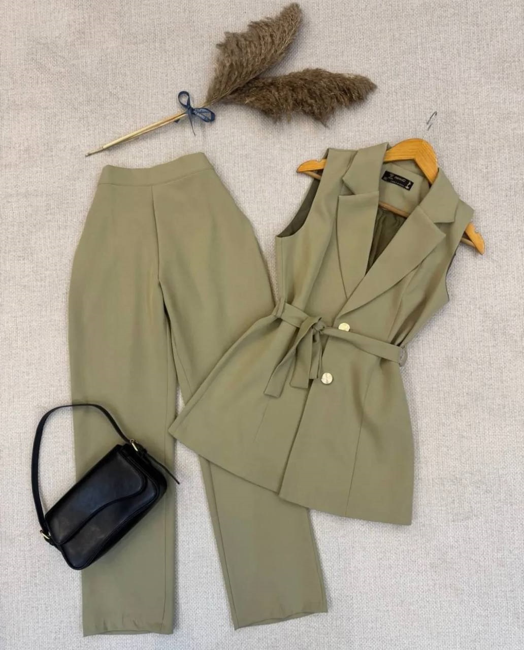 Головна » Магазин » Одяг » Жіночі костюми » Брючный костюм (пиджак под пояс+брюки прямого кроя) костюмка хаки