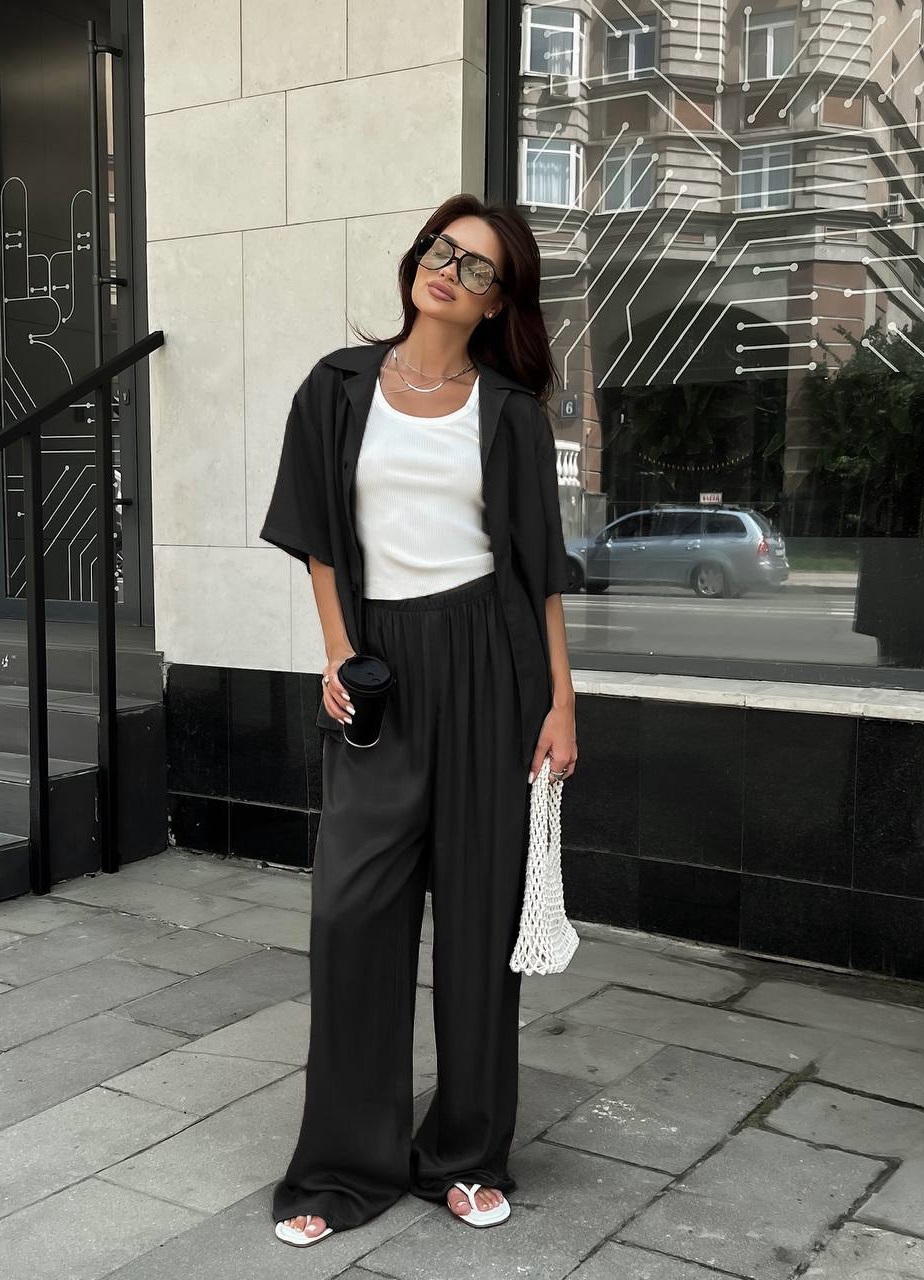 Брючный шелковый костюм (рубашка+брюки с карманами) черный