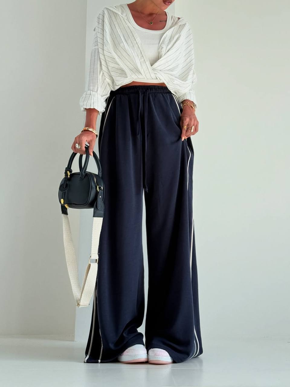 Стильные и комфортные брюки с эластичным поясом и контрастными полосками по бокам. Идеально сочетаются с объемными топами и кроссовками, создавая современный casual look. Легкие, дышащие и удобно сидящие на любой фигуре.