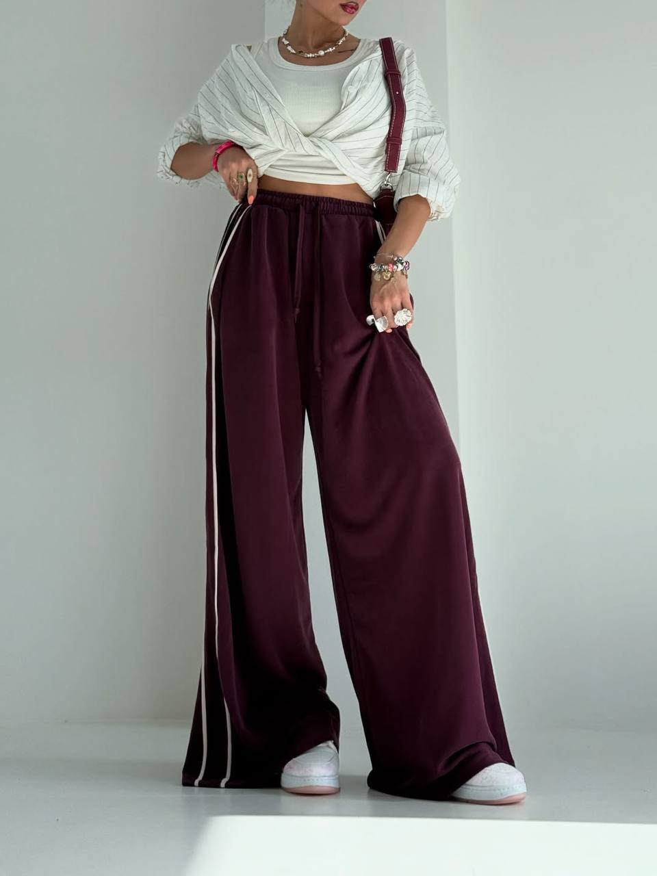 Брюки с эластичным поясом и контрастными полосками по бокам бордо