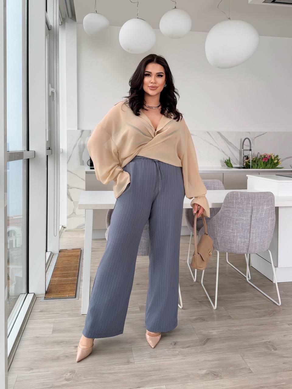 Брюки высокой посадки, с карманами. Талия на резинке и канате.