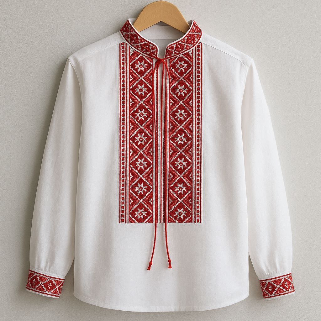 Стильная украинская вышиванка: декоративная лента на груди и рукавах, манжеты на пуговицах и воротник, завязываемый шнурком.