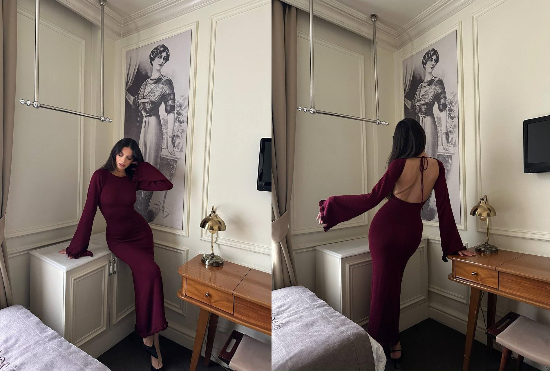 Длинное трикотажное платье с вырезом по спинке+рюшами бордо
