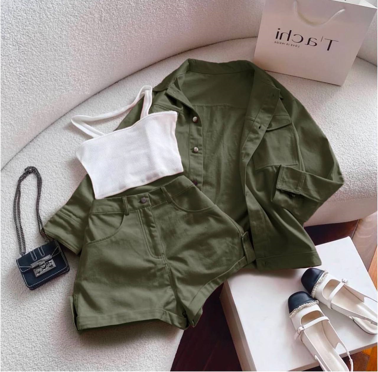 Головна » Магазин » Одяг » Жіночі костюми » Джинсовый костюм (пиджак с карманами+шорты+топ на тонких бретелях) хаки