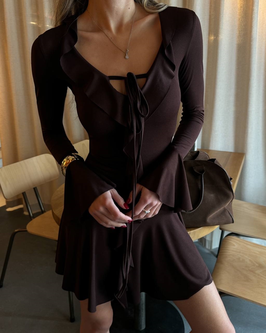 Будьте першим, хто залишив відгук “Эластичное Платье приталенного силуэта с воланами шоколад”“
