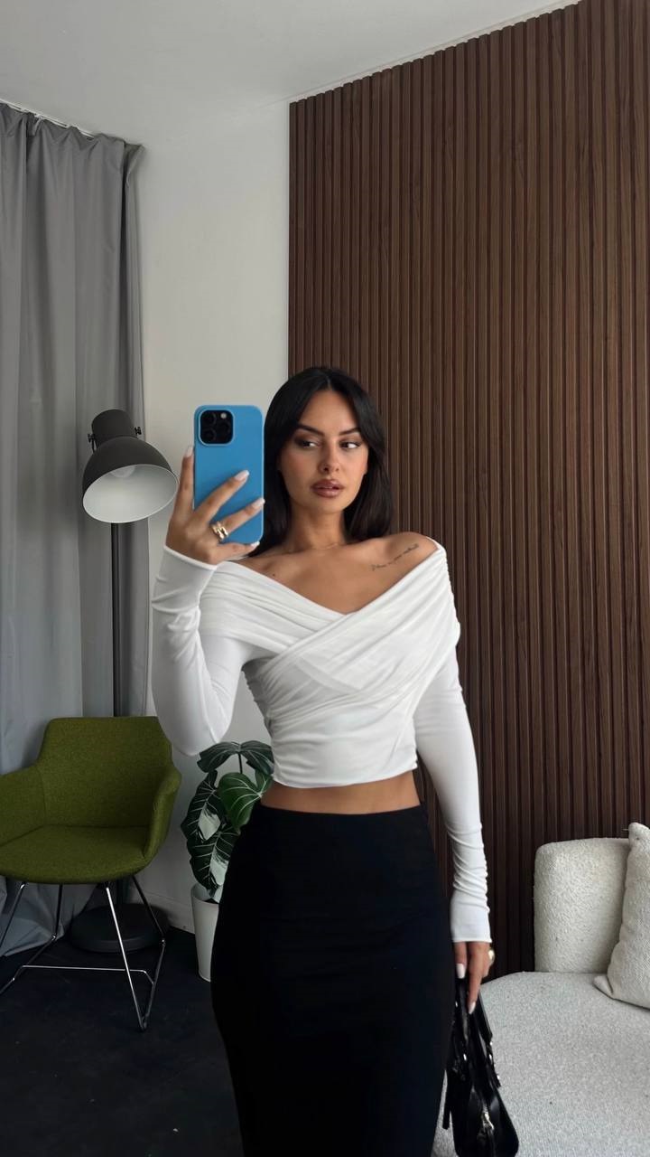 Головна » Магазин » Одяг » T -сорочки Майкі » Эластичный Лонгслив со спущенными плечами молочный