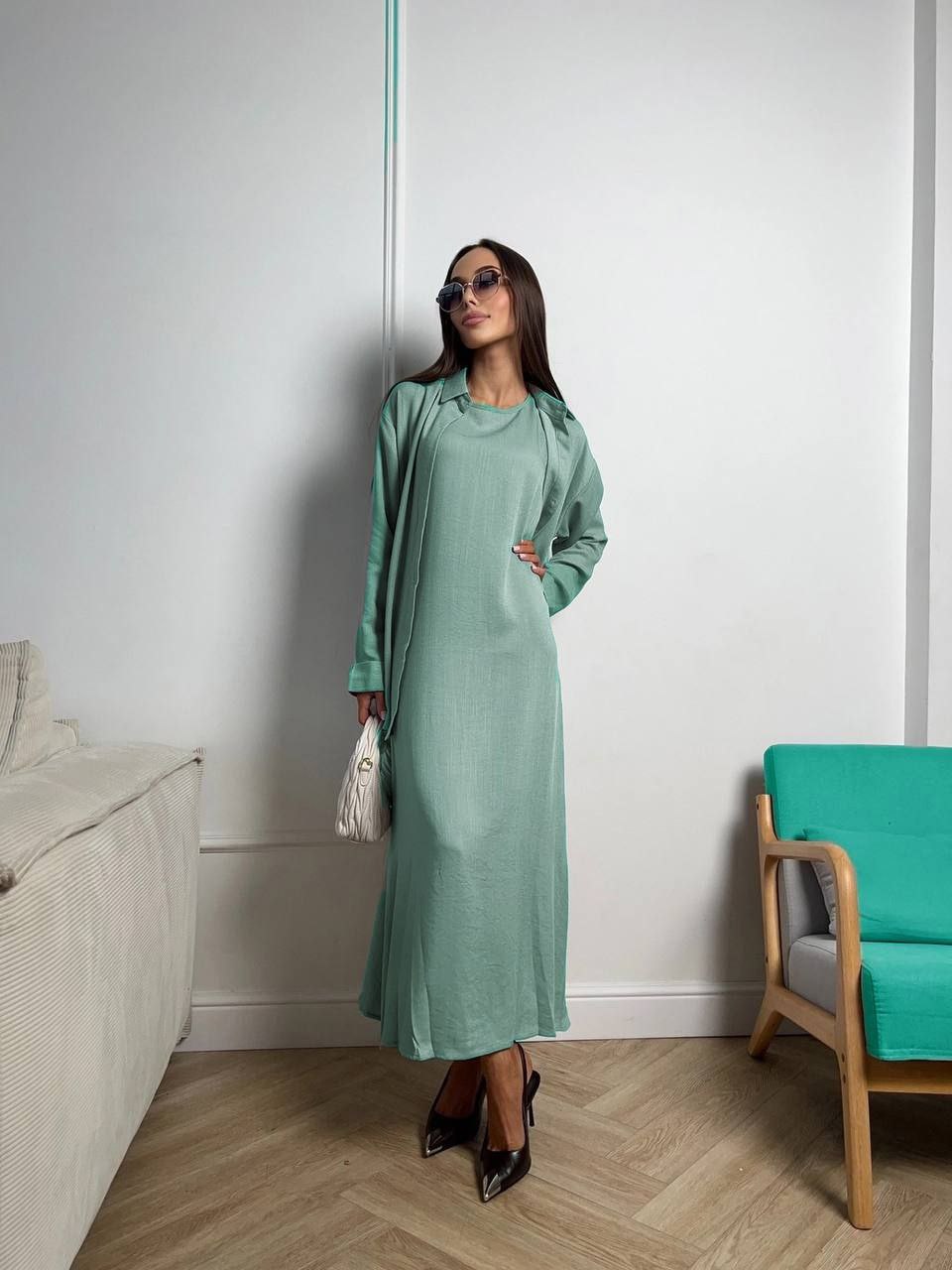 ЭЛЕГАНТНЫЙ И ЛЕГКИЙ КОСТЮМ длинное платье+рубашка фисташка