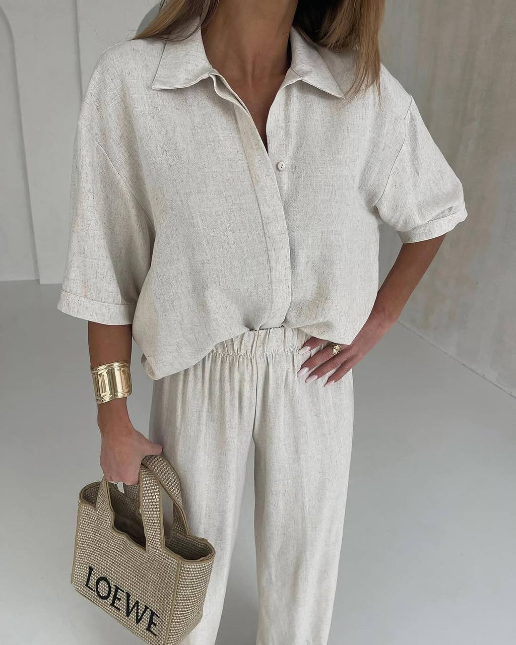 Легкий, дышащий и непринужденно элегантный. Костюм из льна — это комфорт без компромиссов: свободный крой, идеальная посадка на талии и рубашка, которая одинаково хорошо выглядит застегнутой и навыпуск.