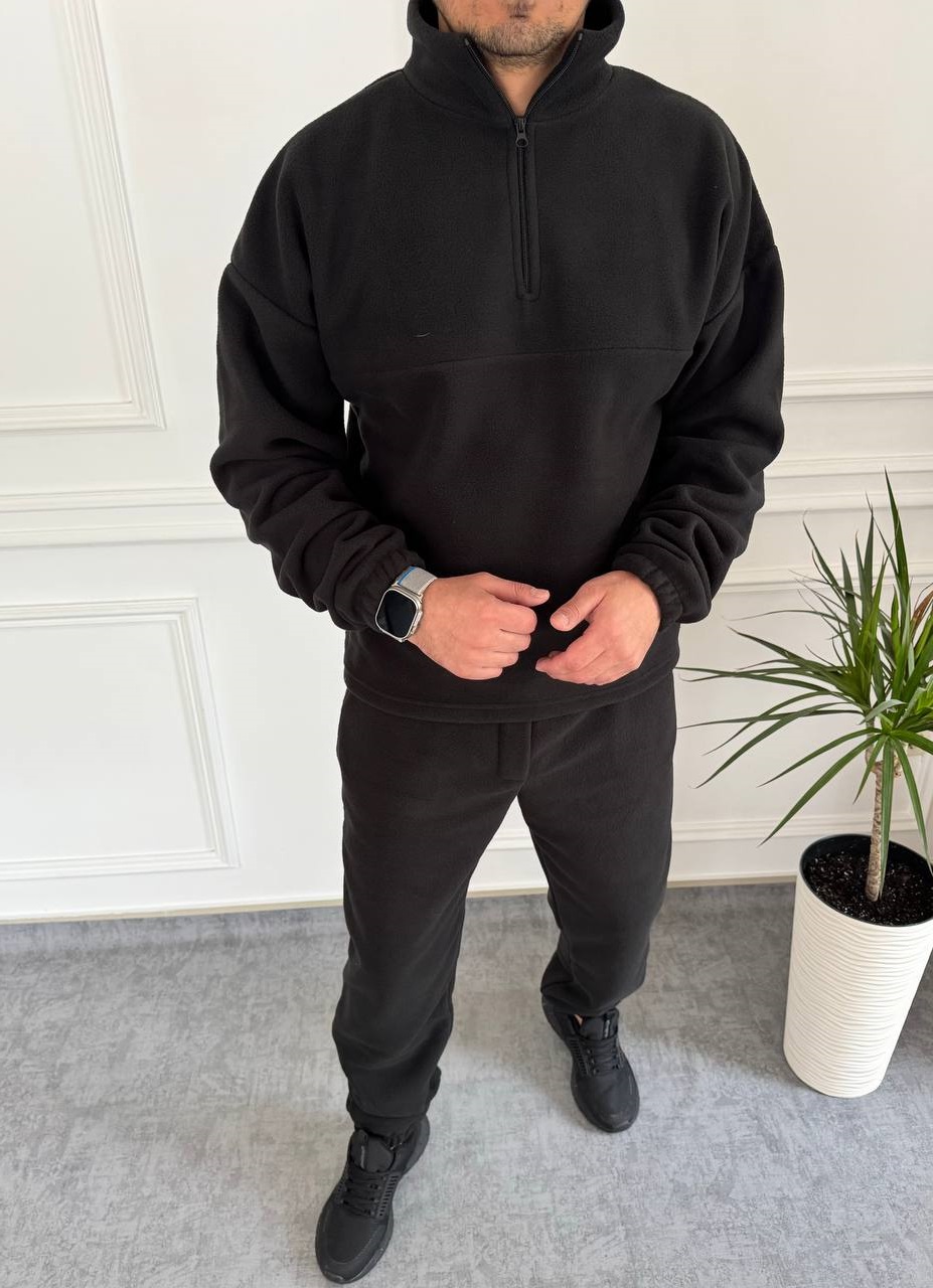 Флисовый мужской костюм (кофта воротник стойка на молнии+брюки с манжетой по низу) черный