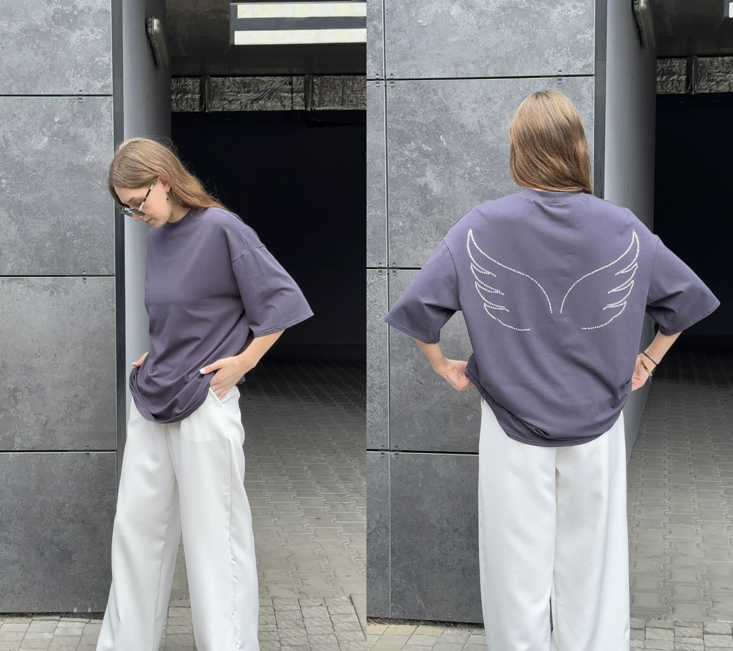 Футболка оверсайз с накатом по спинке камнями Крылья графит