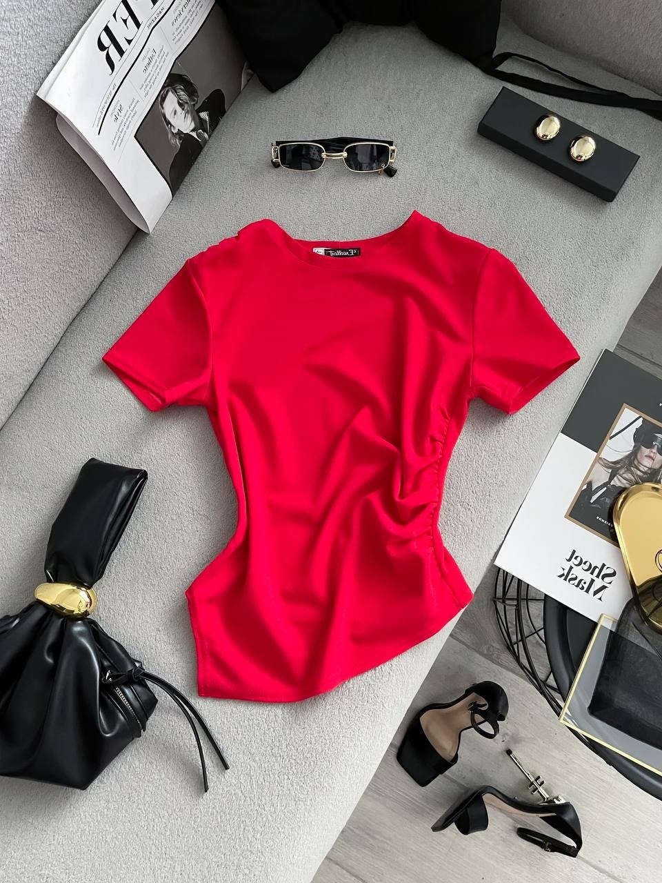 Футболка с акцентным низом в форме треугольника и сборкою с боку и по плечу красный